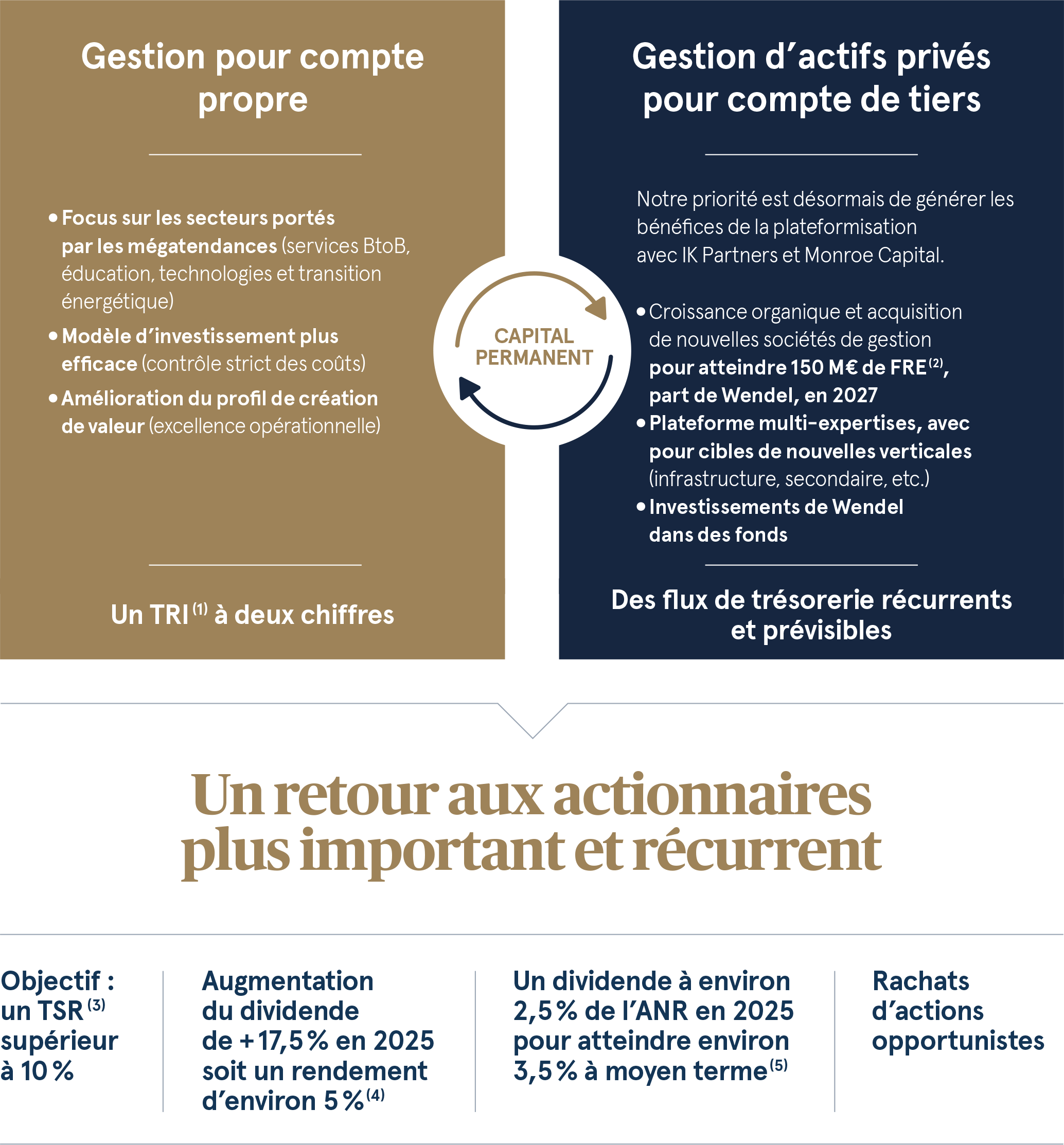 En moins de trois ans, nous avons opéré une transformation stratégique majeure. Nous sommes passés d’une holding d’investissement traditionnelle, avec un seul métier, à une firme d’investissement diversifiée, focalisée sur la création de valeur à long terme via des actifs privés contrôlés pour compte propre et pour compte de tiers. La création de valeur générée par Wendel se fait désormais au bénéfice de ses clients et de ses actionnaires, tout en conservant un ADN d’investisseur de long terme.